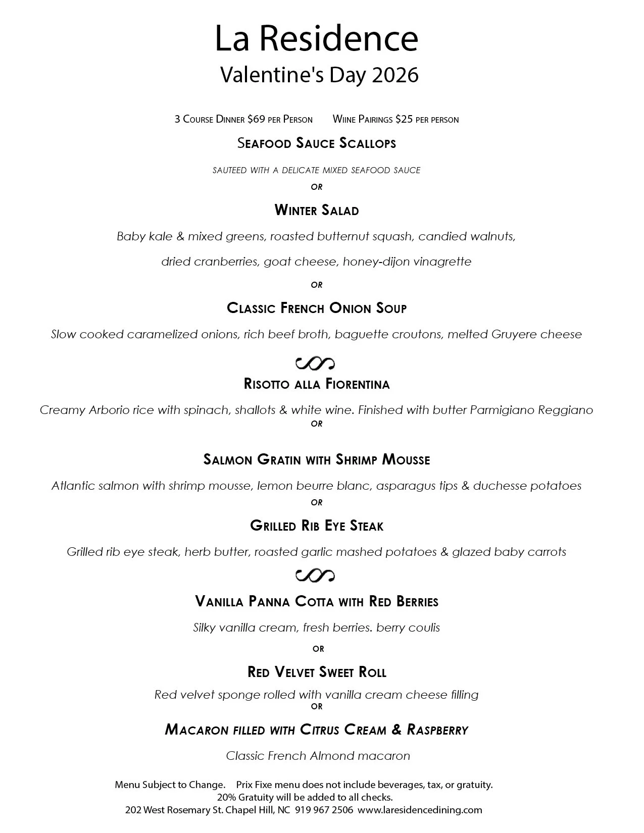 Valentines Weekend Menu